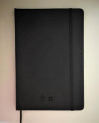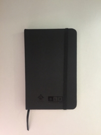 Caderno A5, folhas lisas, capa dura preta, com elástico.